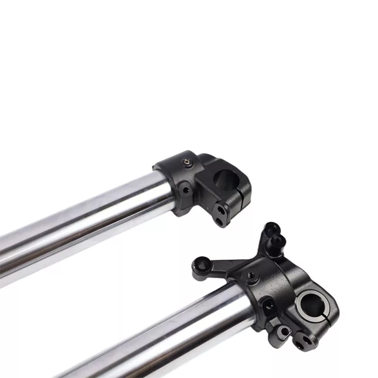 Професионална предна вилка, създадена за офроуд мотоциклети, изработена от алуминиева сплав и солидна стомана, тя е едновременно лека и издръжлива. Използвайки комбинация от масло и пружина за абсорбиране на вибрации, амортисьорът с двойна регулируема обърната предна вилка за електрически велосипед абсорбира вибрациите, причинени от неравни пътни настилки, намалява усещането за неравности по време на каране и подобрява комфорта при каране.