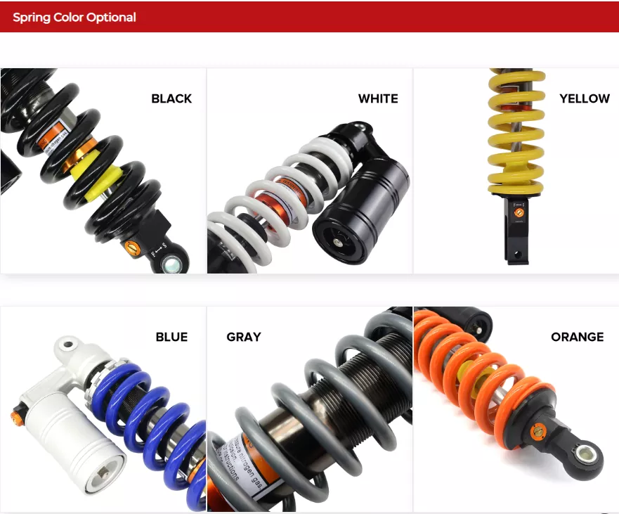 Отскокът и затихването на ATV заден амортис на ATV са направени от алуминиева сплав 6061. Те могат да постигнат регулируемо затихване на отскок, отговарящи на повече екологични изисквания. Техният дизайн на раздяла с маслени газове и технологията за пълнене на азот гарантират стабилността и плавното изживяване на шофирането на всеки терен. Отскокът и затихването на ATV заден амортис на ATV може да се персонализира не само по дължина, но и по цвят и лого, което го прави по -персонализиран.